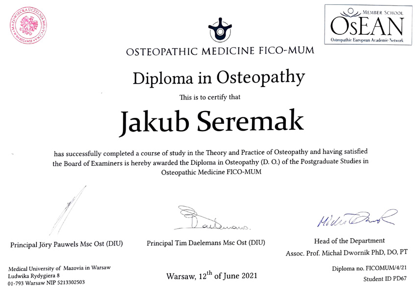 Podjęcie kolejnego etapu kształcenia w belgijskiej szkole osteopatii FICO (Flanders International College of Osteopathy) umożliwiło mi rozwój moich umiejętności i wiedzy i zaowocowało zdobyciem tytułu dyplomowanego osteopaty (D.O.).