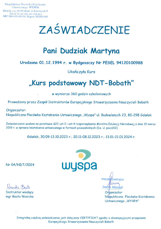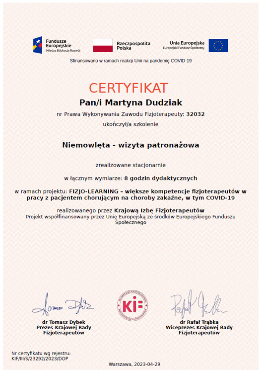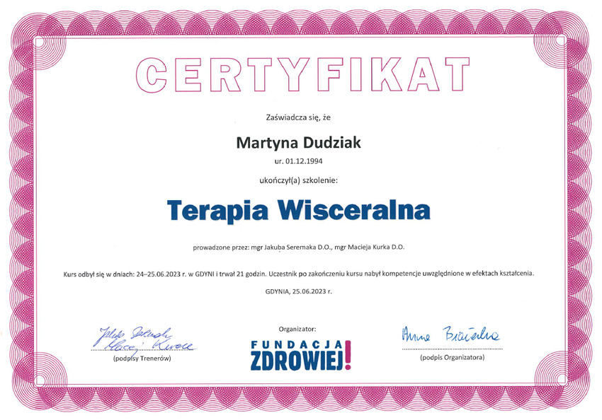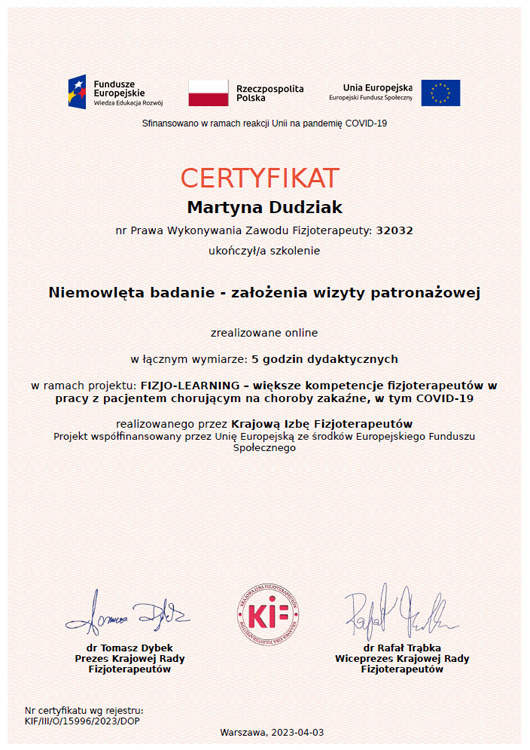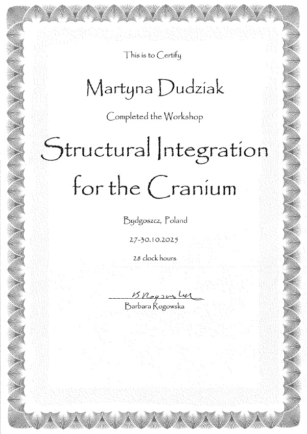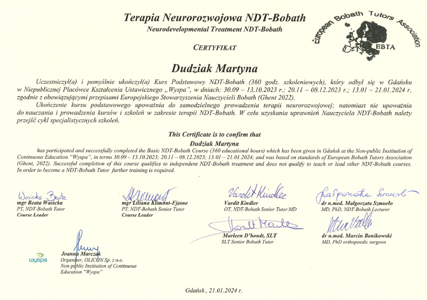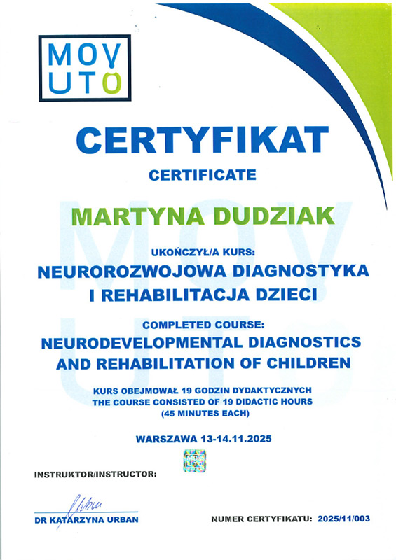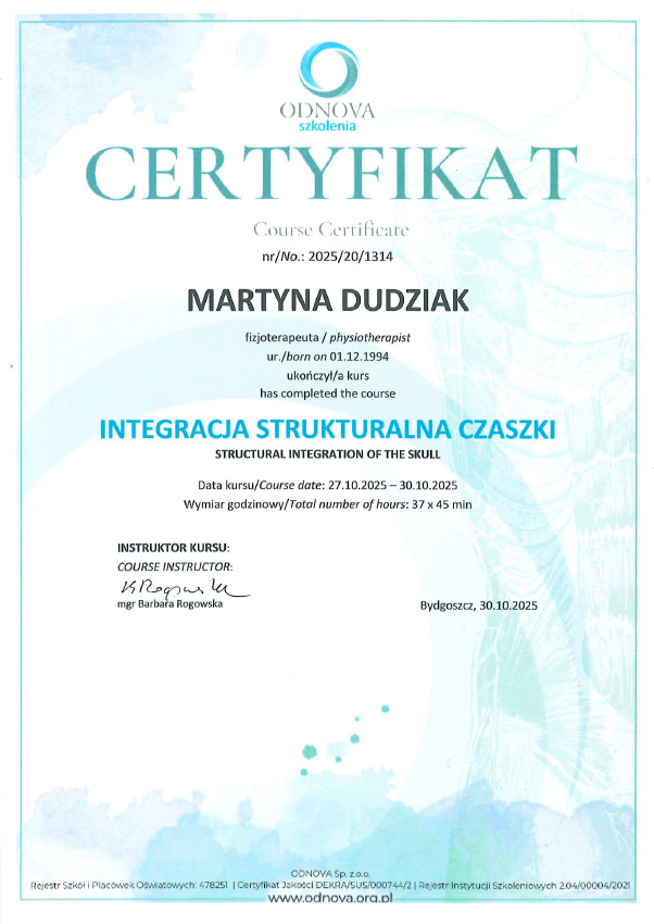 Jestem absolwentką studiów magisterskich na Uniwersytecie Mikołaja Kopernika w Toruniu Collegium Medicum w Bydgoszczy oraz ukończyłam szkołę policealną na kierunku Technik Masażysta. Zajmuję się fizjoterapią dzieci z opoźnieniem rozwoju, wadami postawy, skoliozami, oraz zaburzeniami neurologicznymi i chorobami genetycznymi. W swojej pracy wykorzystuję koncepcję NDT Bobath, terapię mięśniowo-powięziową, metodę PNF oraz elementy terapii osteopatycznej. W pracy stawiam na indywidualne podejście do dziecka oraz dobry kontakt z pacjentem i rodzicami.