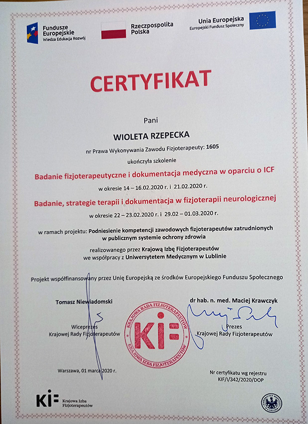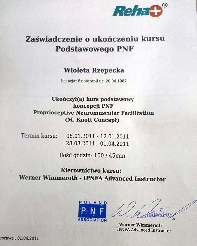 Jestem magistrem fizjoterapii, absolwentką Collegium Medicum UMK w Bydgoszczy. Pracuję zawodowo od 2011 roku. Moja przygoda z usprawnianiem Pacjentów zaczęła się na Oddziale Neurologicznym w Poradni rodzinnej „ZDROWIE”, gdzie pod okiem świetnego Osteopaty Michała Kłoska (obecny wiceprezes Krajowej Rady Fizjoterapeutów), mogłam zmierzyć się z trudnymi przypadkami urazów czaszkowo-mózgowych, ostrymi i przewlekłymi stanami po udarach mózgu czy chorobami neurodegeneracyjnymi (jak np. Parkinson, Alzheimer).