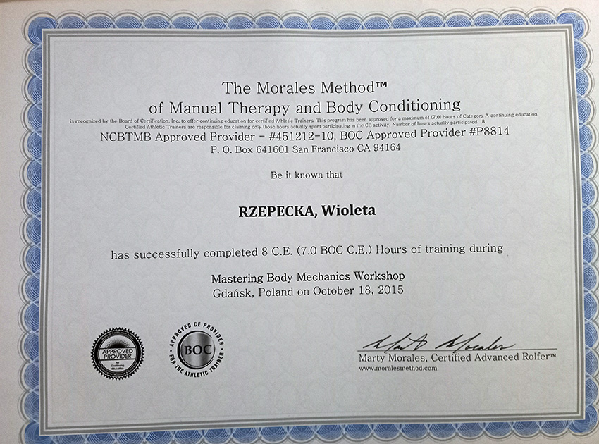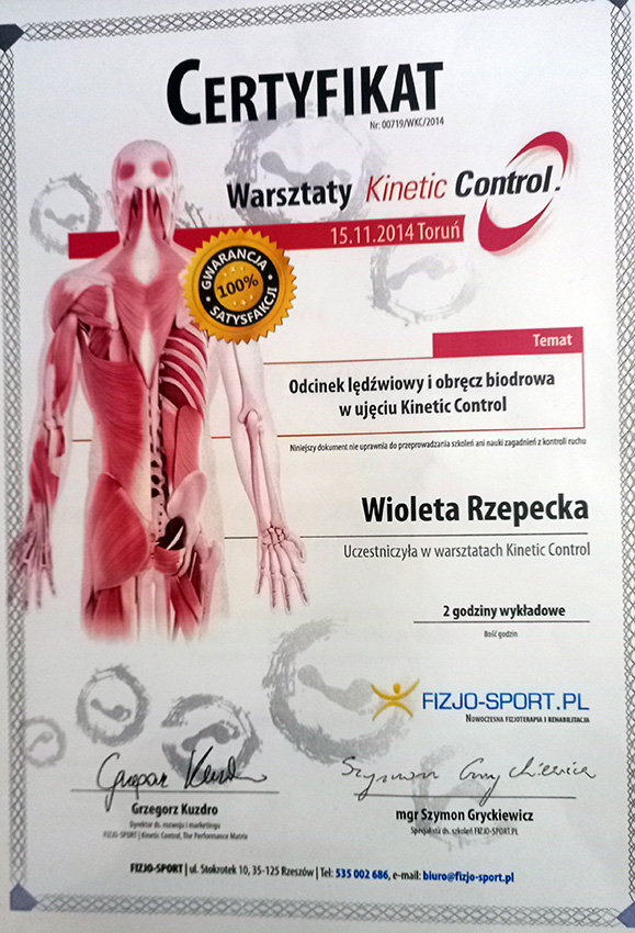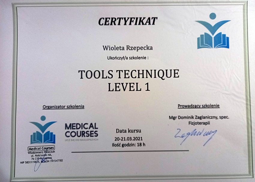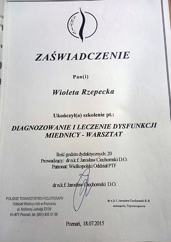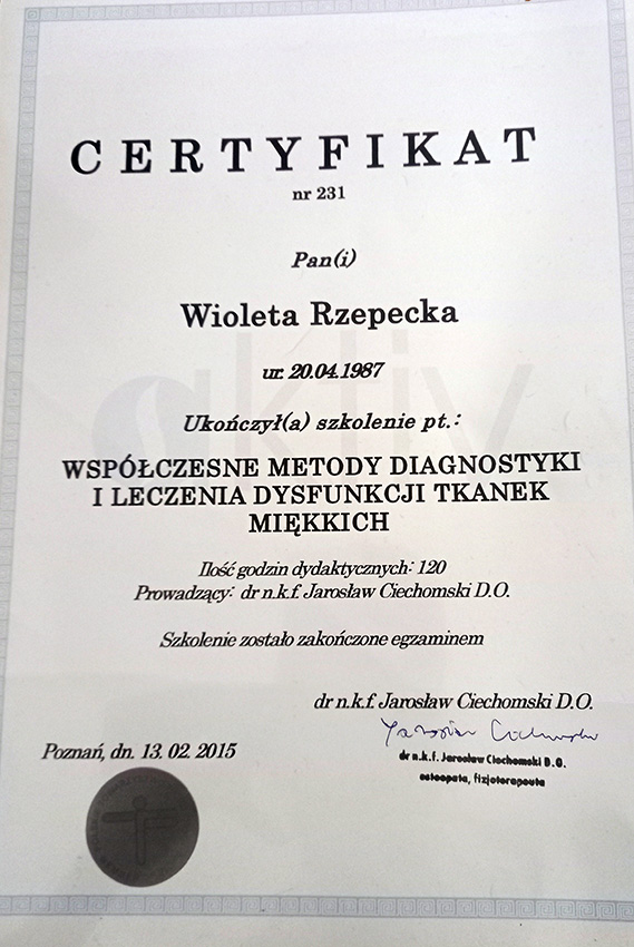 Fascynacja zawodem spowodowała poszerzenie wiedzy z zakresu metod diagnozowania i leczenia tkanek miękkich u Jarosława Ciechomskiego (cykl 6 szkoleń zakończony egzaminem). Pozwoliło mi to uzyskać współpracę z placówkami takimi jak np. Remedis w Toruniu, gdzie pojawiali się między innymi sportowcy ze Szkoły Mistrzostwa Sportowego.